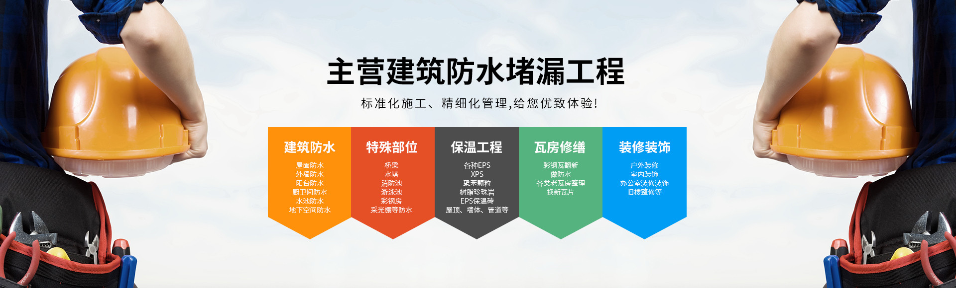 建筑防水:屋面防水、外墙防水、阳台防水,厨卫间防水、水池防水,地下空间防水。